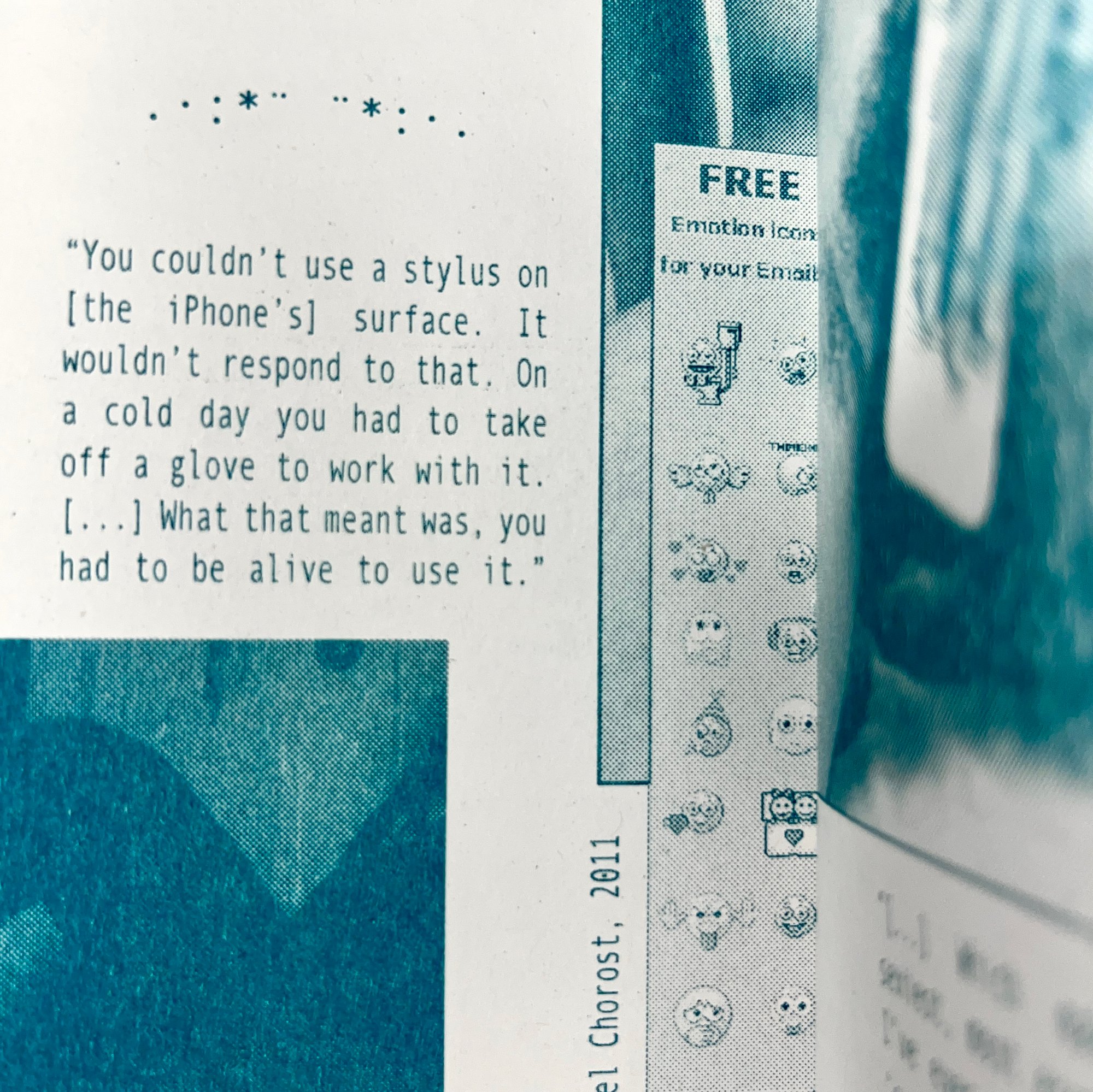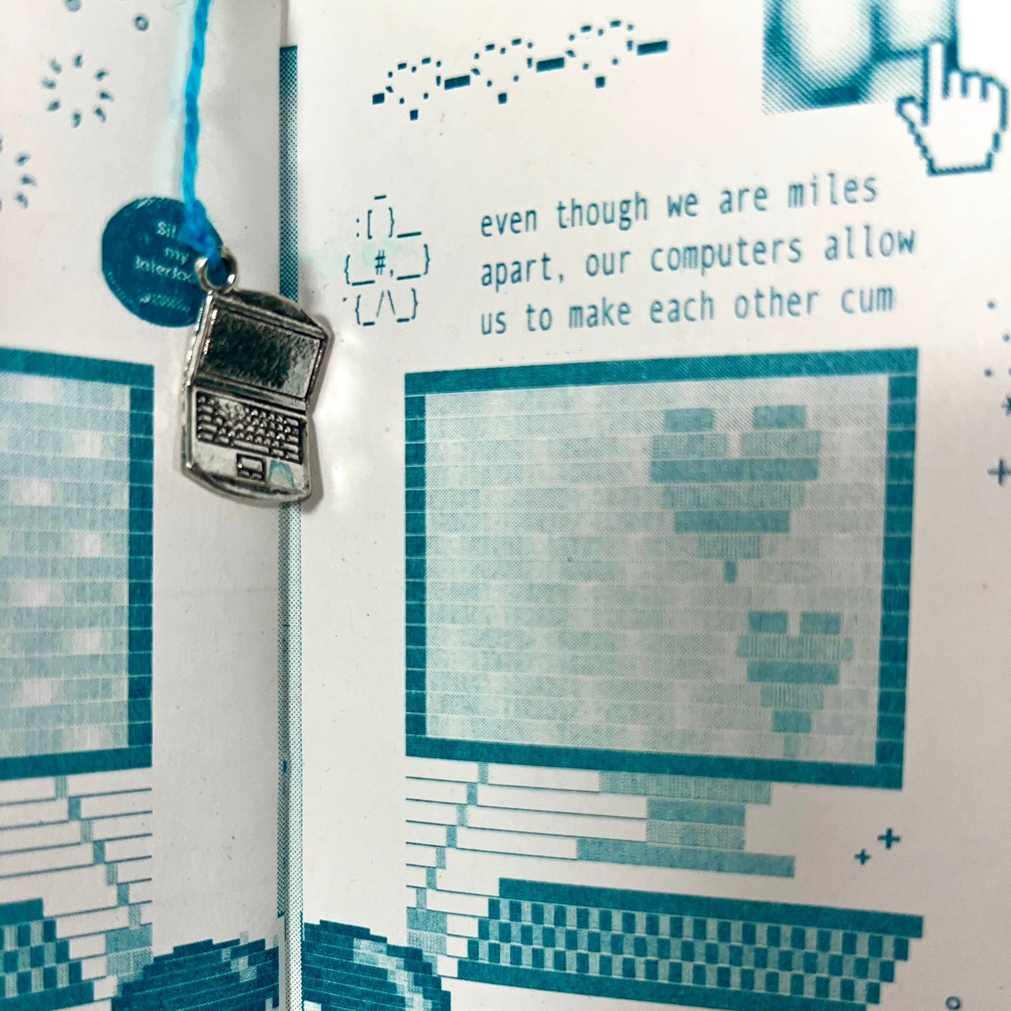 16pp zine, risoprinted & handbound with charm attached. 7 x 15cm.